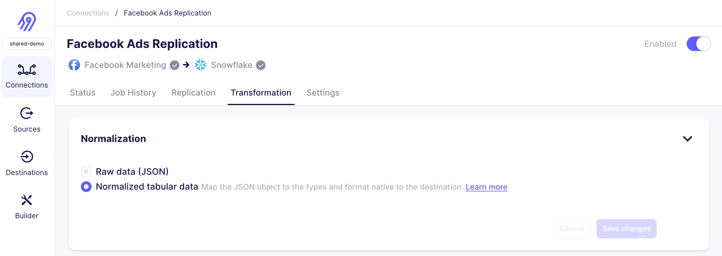 2. If the streams you are looking to replicate are in full refresh mode, enabling the connection will now provide a parallel copy of the data in the updated format for testing. If any of the streams in the connection are in an incremental sync mode, follow the steps below before enabling the connection.